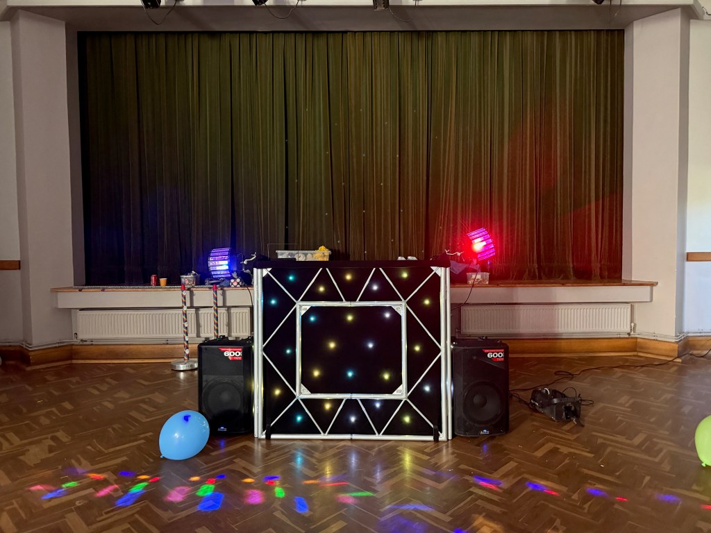 - Full professional disco set up (fully checked by a qualified electrician and PAT tested), includes multi-coloured disco lights, PA sound system with microphone, with bubble, snow or smoke machine*